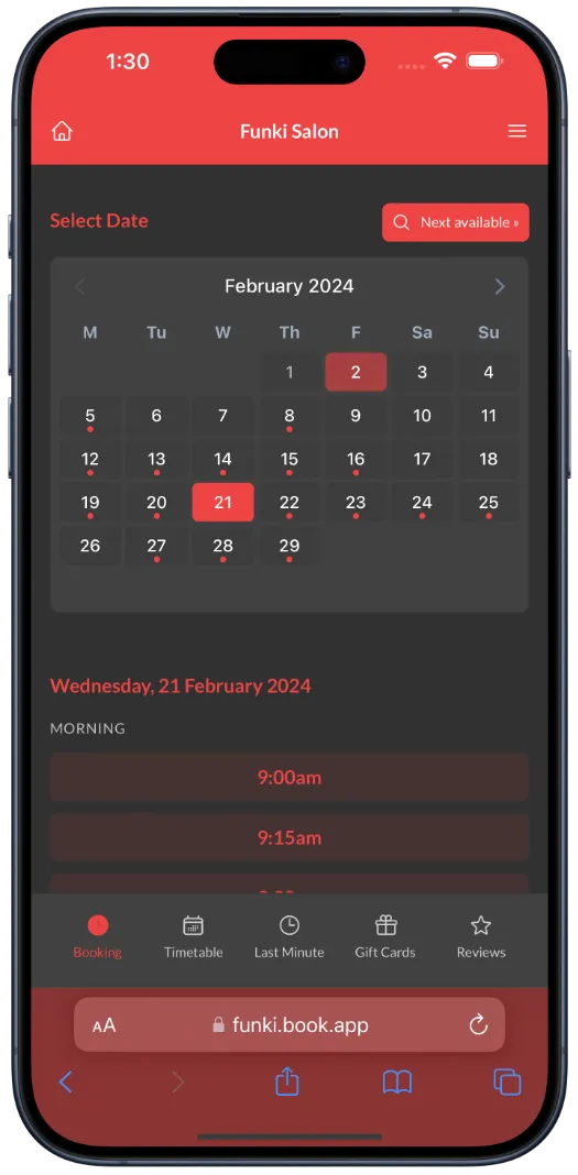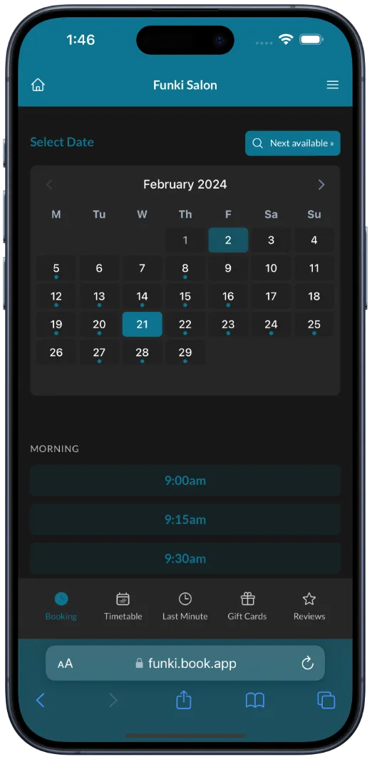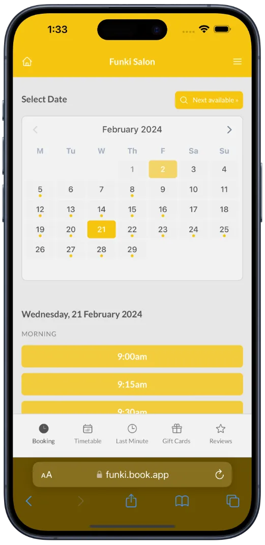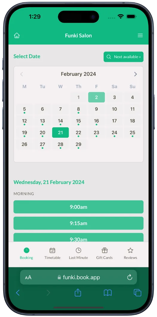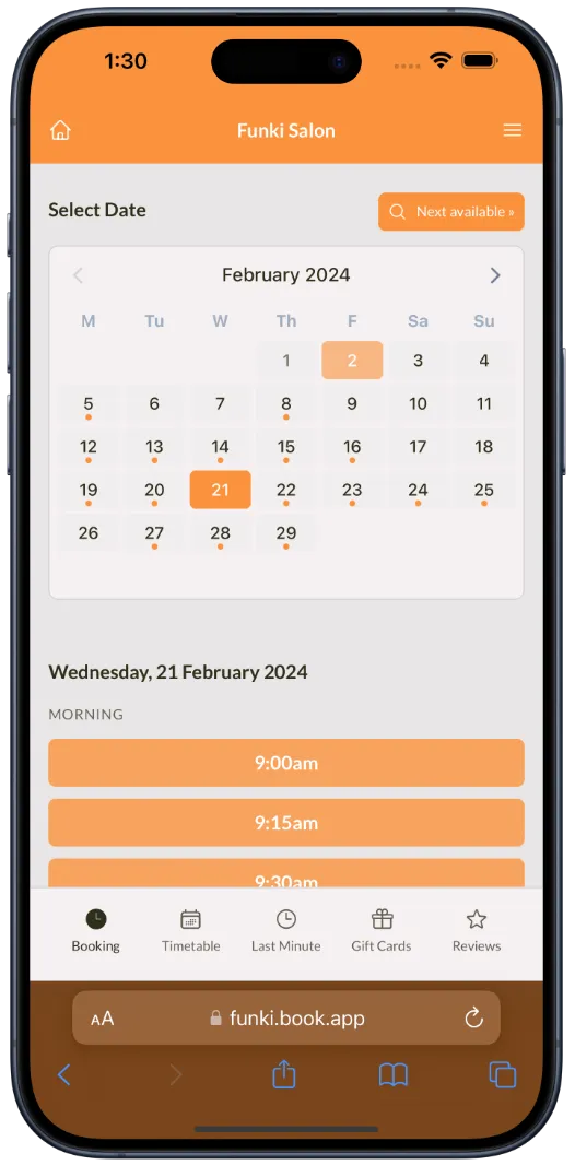 With your own personal branding and exclusive book.app domain.Save time, and look fabulous doing it! Customise colours, fonts, images, and more!